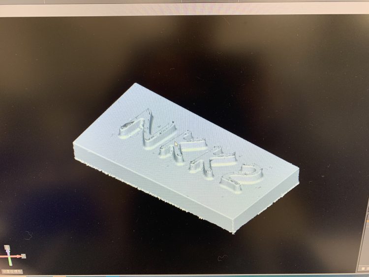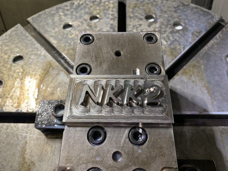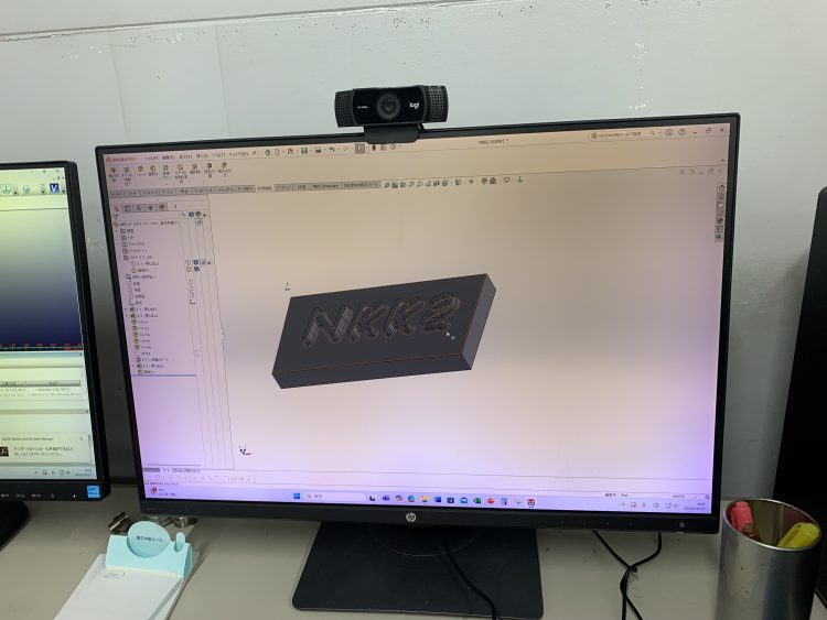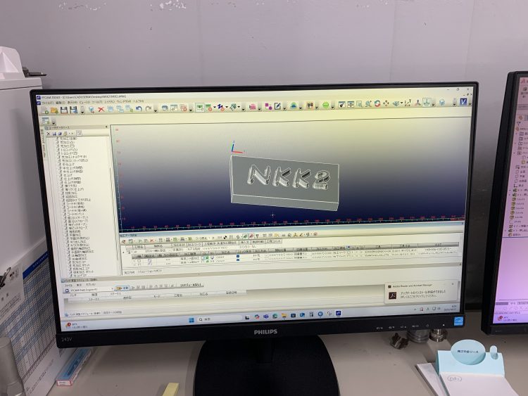 自分でどのようなモノを加工してみたいかを考え、自分でCADを操作しモデルを作成していきます。今回はプレートに文字をモデリングし、加工をする際にどうすれば加工をしやすいモデルになるのかを一緒に考えモデリングを完成させました。「NKK2」という文字は『沼津工業高校 機械科 2年』の略称です。
